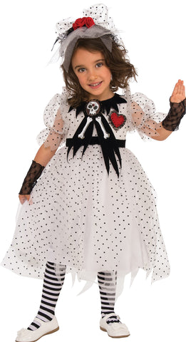 - Ghost costume dress white with small black polka dots, black and white striped tights, headpiece, and black lacey gauntlets
